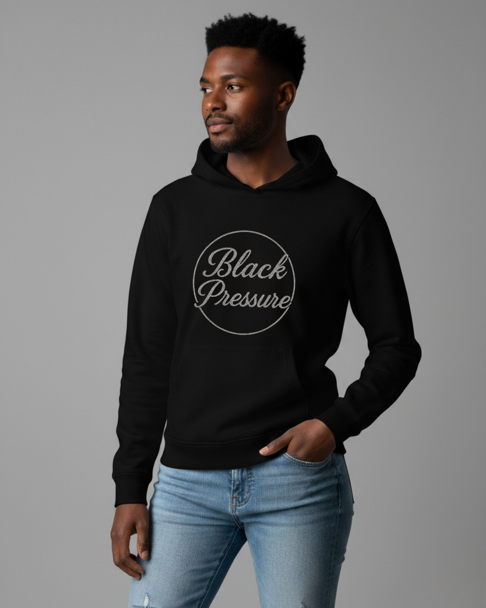 The Black Pressure Hoodie blends minimal design with bold streetwear attitude. Featuring a clean circular script graphic, this piece represents strength, focus, and resilience under pressure.