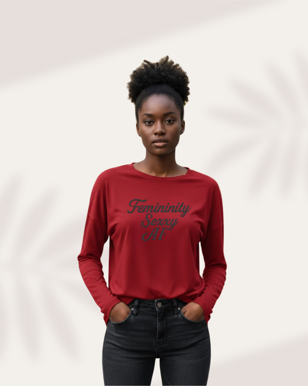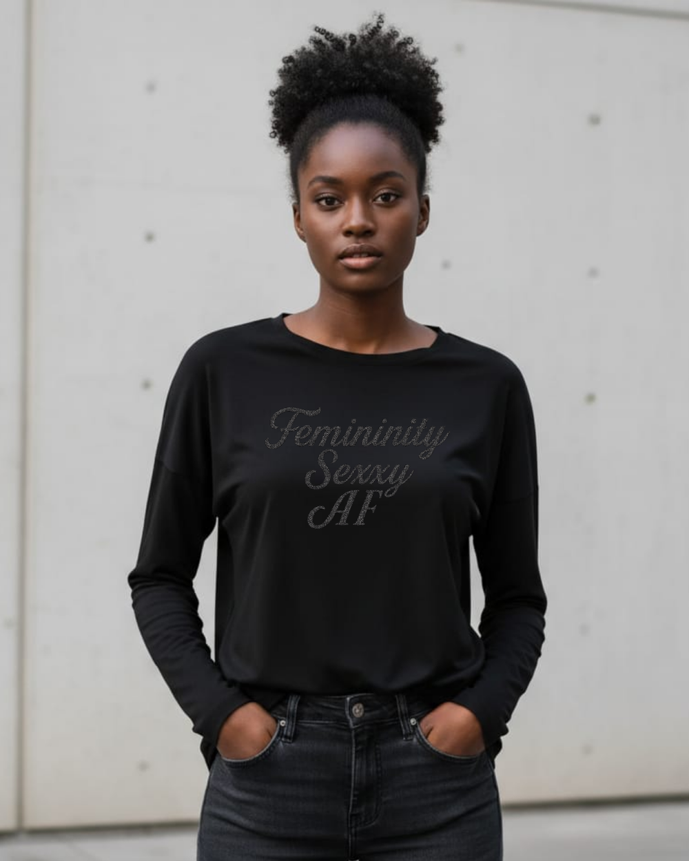 This bold statement design celebrates feminine power, confidence, and unapologetic style. Featuring an elegant script graphic with a glamorous textured finish, this piece instantly elevates any casual outfit.